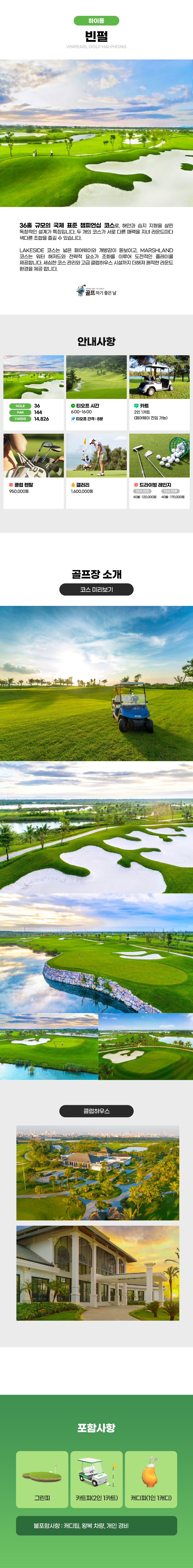 ✔️ 예약 가능 라운드 기간  ~ 2026.09.30 (수) ✅ 포함 사항  그린피  카트피 (2인 1카트)  캐디피 (1인 1캐디) ❌ 불포함 사항  캐디팁 (400,000~500,000동 / 1인)  픽업/드랍 차량  여행자 보험 📢 참고 사항  결제 완료 후 골프장에 예약이 진행되며, 예약 확정까지 시간이 소요될 수 있습니다.  4인 미만 예약 시 골프장 요청에 따라 조인 될 수 있습니다.  호텔 ↔ 골프장 왕복 차량 문의는 카카오톡 채널로 부탁드립니다.  골프클럽·골프화·우산 렌탈 가능합니다. (현장 결제)  여행자 보험 개별 가입을 권장드립니다.  기타 문의 사항은 카카오톡 채널로 연락 주시면 상세 안내해 드리겠습니다.